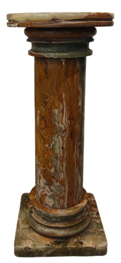 An elegant onyx pedestal with a classical column, with a circular top and layered base.